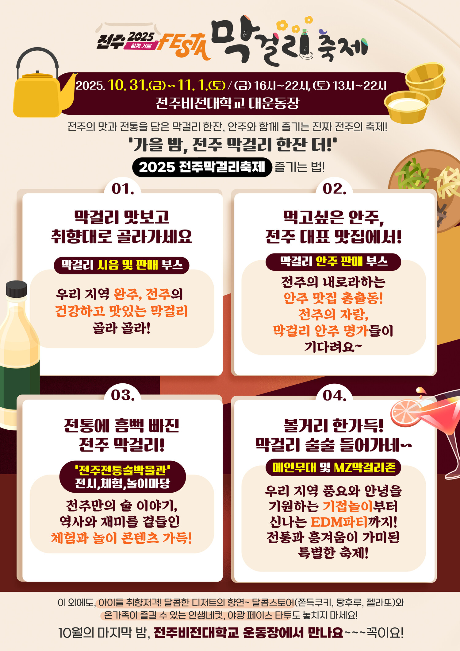 ‘막걸리 한 잔의 여유로 가을밤을 물들이다’ 전주하면 빼놓을 수 없는 막걸리! 2025년에도 전주막걸리축제가 찾아옵니다.