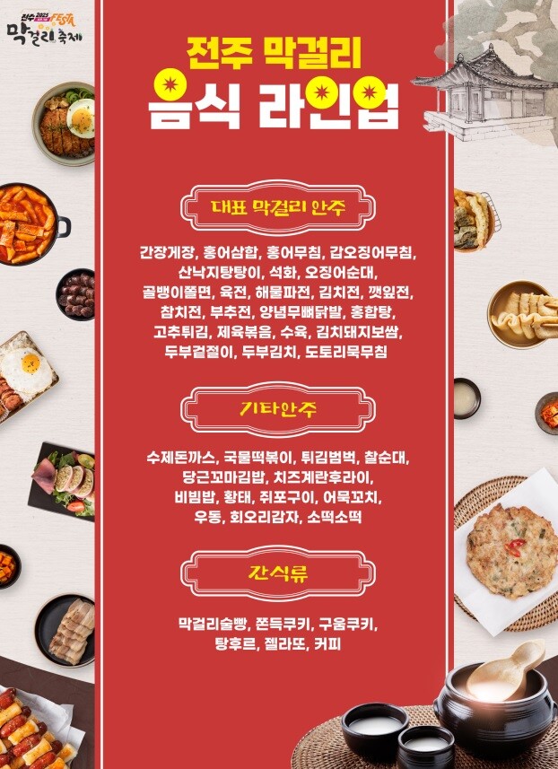 막걸리뿐만 아니라 전주의 대표 먹거리들이 한자리에 모입니다. 비빔밥, 오목대 불고기, 전주콩나물국밥 등 ‘전주 맛로드존’이 운영됩니다.